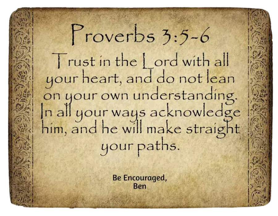 Proverbs 3:5-6 Trust in the Lord with all your heart, and do not lean on your own understanding. In all your ways acknowledge him, and he will make straight your paths.