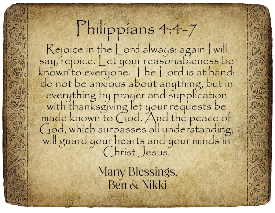 Philippians 4:4-7 Rejoice in the Lord always; again I will say, rejoice. Let your reasonableness be known to everyone. The Lord is at hand; do not be anxious about anything, but in everything by prayer and supplication with thanksgiving let your requests be made known to God. And the peace of God, which surpasses all understanding, will guard your hearts and your minds in Christ Jesus.
