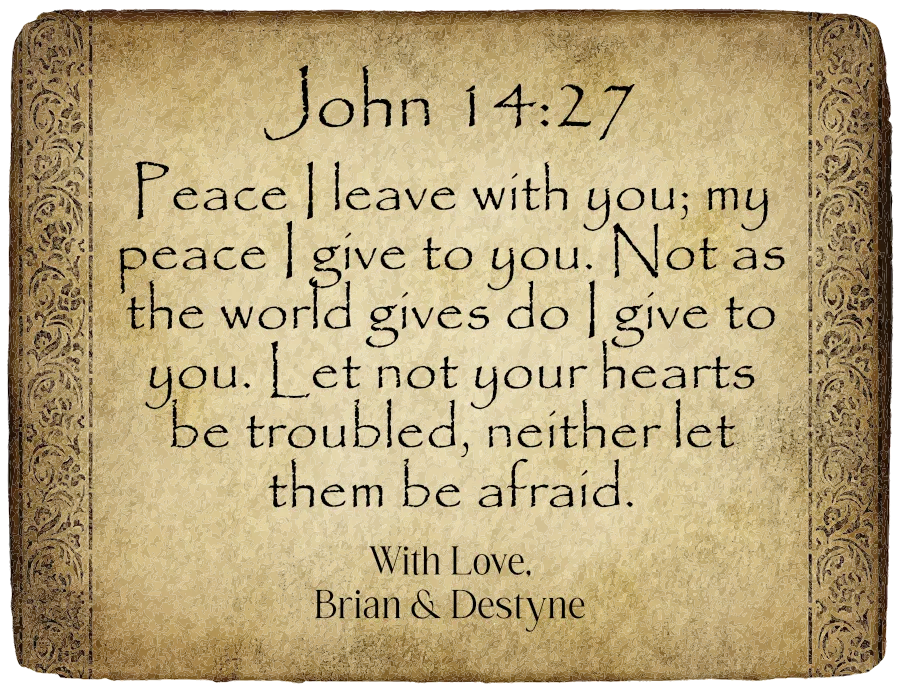 John 14:27 Peace I leave with you; my peace I give to you. Not as the world gives do I give to you. Let not your hearts be troubled, neither let them be afraid.
