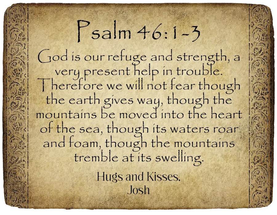 Psalm 46:1-3 God is our refuge and strength, a very present help in trouble. Therefore we will not fear though the earth gives way, though the mountains be moved into the heart of the sea, though its waters roar and foam, though the mountains tremble at its swelling.