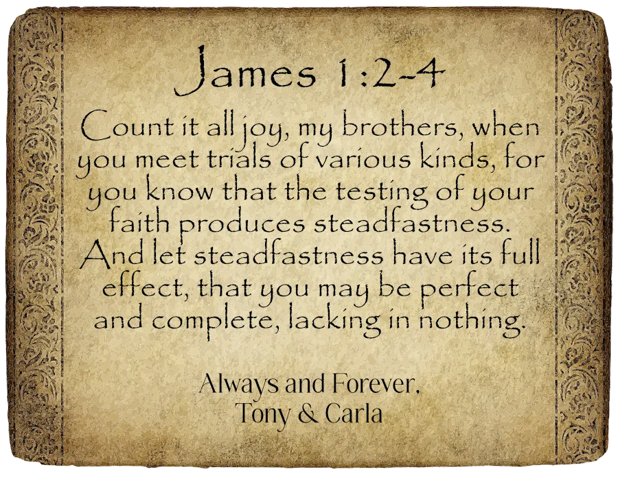 James 1:2-4 Count it all joy, my brothers, when you meet trials of various kinds, for you know that the testing of your faith produces steadfastness. And let steadfastness have its full effect, that you may be perfect and complete, lacking in nothing.