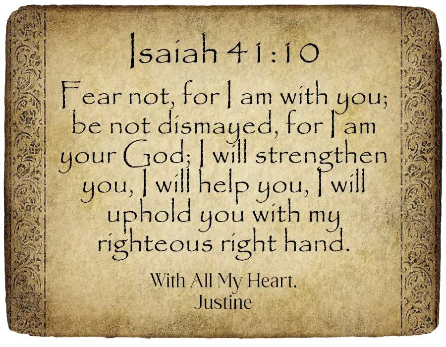Isaiah 41:10 Fear not, for I am with you; be not dismayed, for I am your God; I will strengthen you, I will help you, I will uphold you with my righteous right hand.