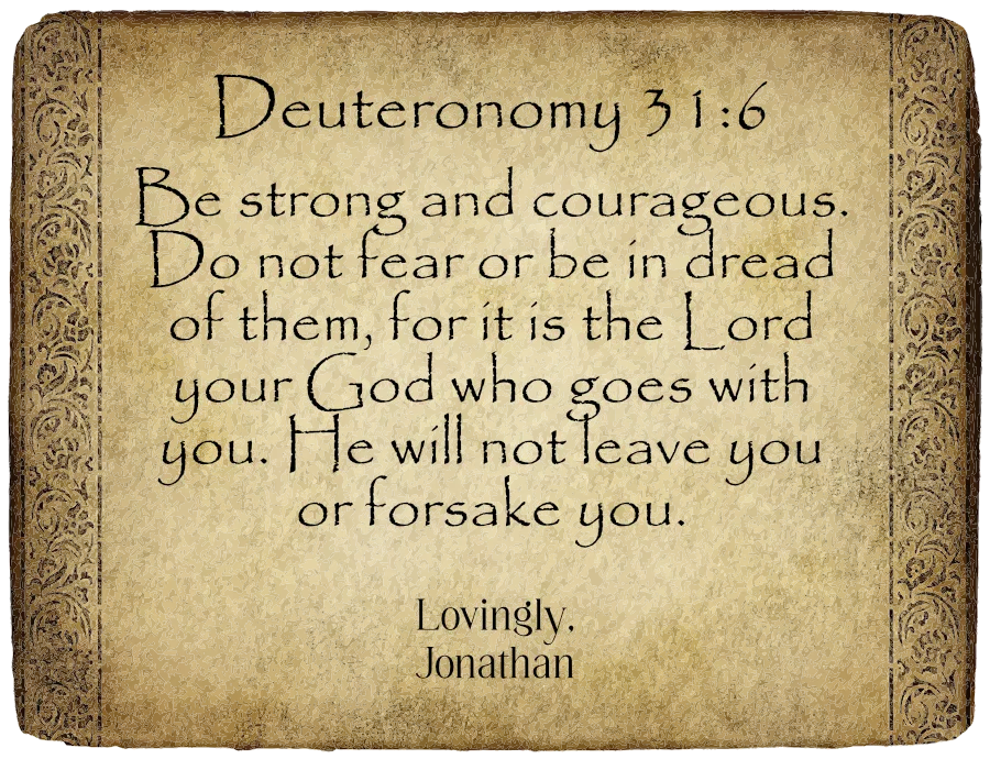 Deuteronomy 31:6 Be strong and courageous. Do not fear or be in dread of them, for it is the Lord your God who goes with you. He will not leave you or forsake you.