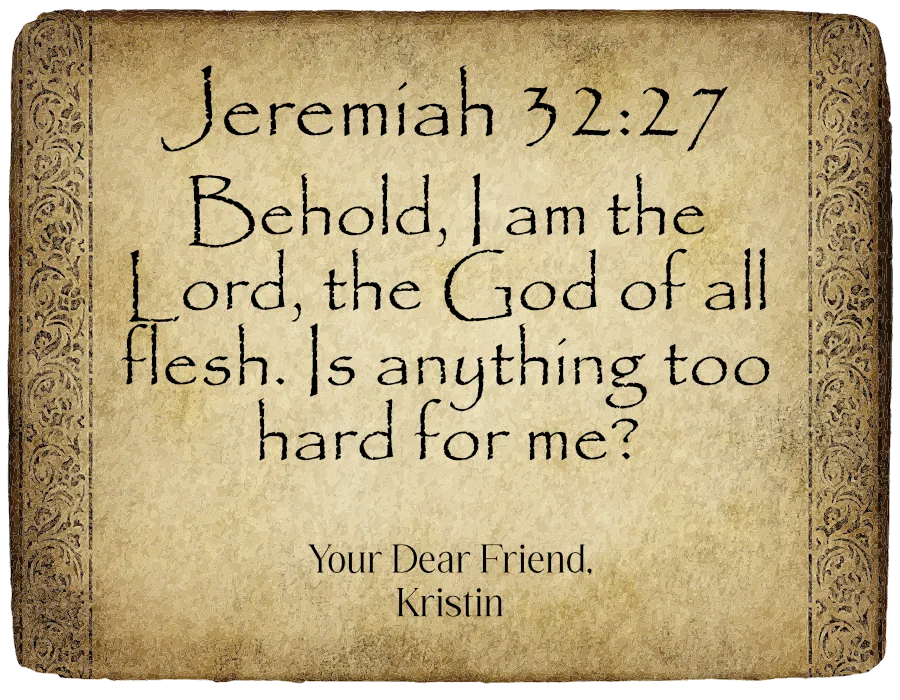 Jeremiah 32:27 Behold, I am the Lord, the God of all flesh. Is anything too hard for me?