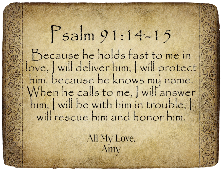 Psalm 91:14-15 Because he holds fast to me in love, I will deliver him; I will protect him, because he knows my name. When he calls to me, I will answer him; I will be with him in trouble; I will rescue him and honor him.