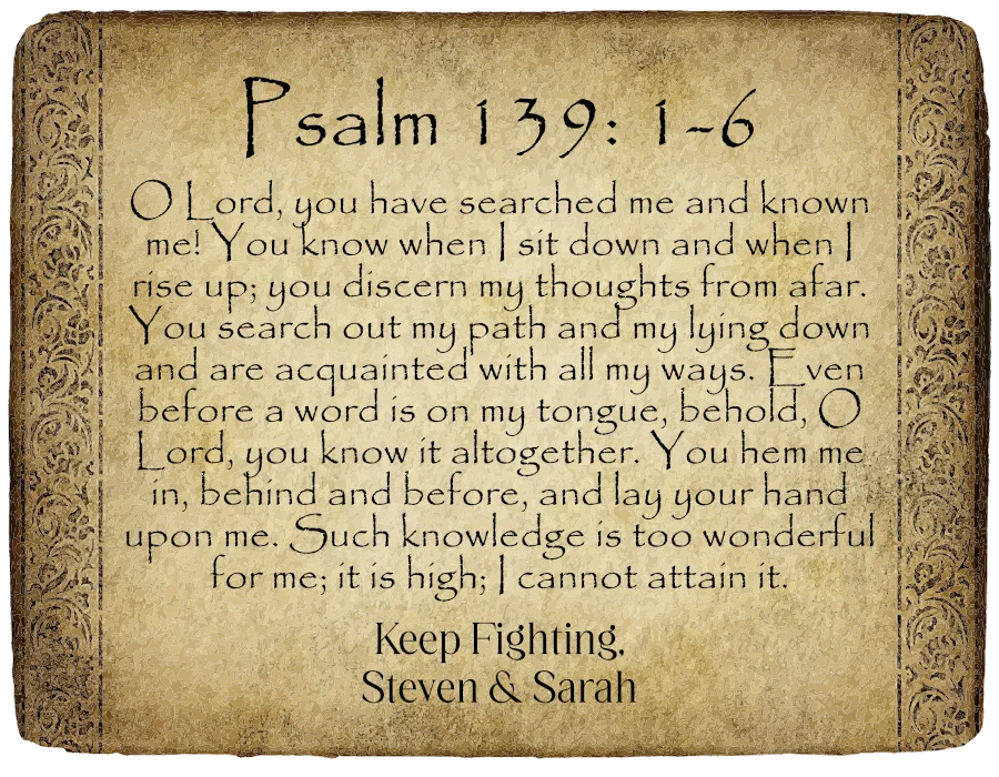 Psalms 139: 1-6 O Lord, you have searched me and known me! You know when I sit down and when I rise up; you discern my thoughts from afar. You search out my path and my lying down and are acquainted with all my ways. Even before a word is on my tongue, behold, O Lord, you know it altogether. You hem me in, behind and before, and lay your hand upon me. Such knowledge is too wonderful for me; it is high; I cannot attain it.